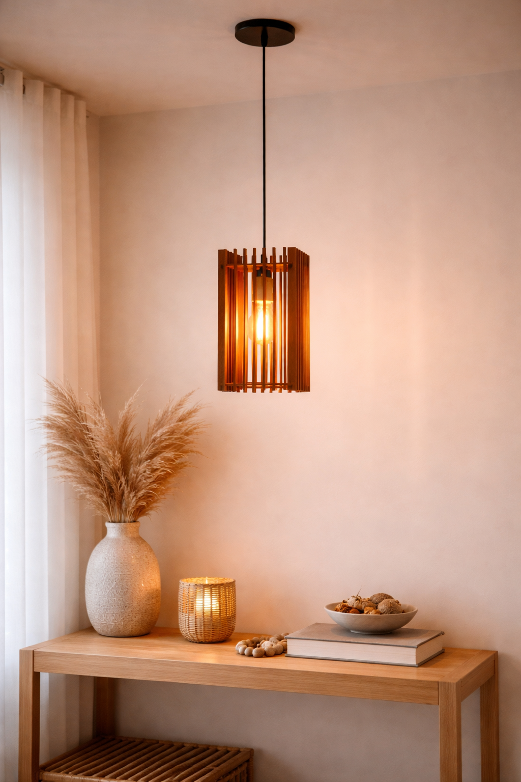 Produzido em MDF, seu design vazado com frestas verticais permite que a luz se espalhe de maneira suave e envolvente, criando um efeito que traz profundidade, aconchego e personalidade ao espaço.